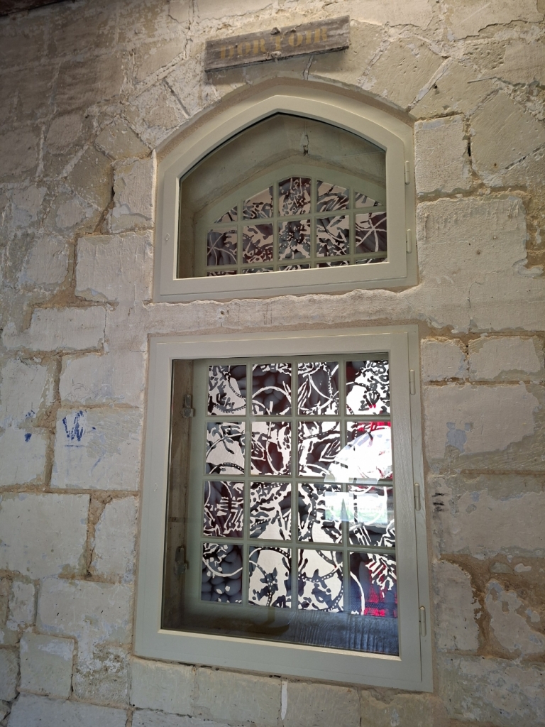Photo 4. Dans le couloir qui longe le bâtiment côté nord, à hauteur des pseudo volets, la galerie pénitentiaire alterne témoignages de deux univers: les sombres et verrouillées portes de prison de jadis et au travers des circonvolutions d'un tressage blanc les taches de couleur de la vie d'aujourd'hui . Le dehors est là, par derrière. La sédimentation est à l'œuvre, comme l'abbaye a sa longue histoire.
