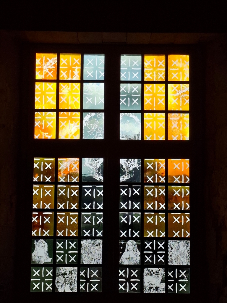 Photo 2 et 2bis: Sur les hautes fenêtres, comme portées par la croix que forme le chassis de bois, s'éparpillent de multiples croisillons formant grillage - serait-ce un rappel des confessionnaux ? - sur un fond rayonnant de jaune d'argent,. Cette technique médiévale appliquée ici sur le fond vert de la végétation exterieure, répond à la complexité de l'histoire. Viennent se glisser des portraits d'Aliénor d'Aquitaine, de quelques fous et d'inclassifiables sédiments. Que de mouvementsdans cette surface qui rappelle ainsi la longue histoire des lieux. Au dessus, dans l'ogive d'uneouverture, un large tryskèle se déploie dans toute sa gloire tranquille et exhaltante.