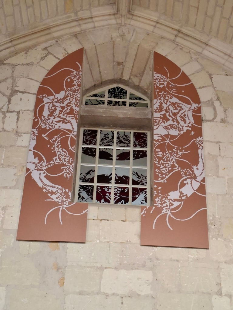 portées par la croix que forme le chassis de bois, s'éparpillent de multiples croisillons formant grillage - serait-ce un rappel des confessionnaux ? - sur un fond rayonnant de jaune d'argent. Cette technique médiévale appliquée ici sur le fond vert de la végétation exterieure, répond à la complexité de l'histoire. Viennent se glisser, gravés dans le verre, des portraits d'Aliénor d'Aquitaine, de quelques fous et d'inclassifiables sédiments, comme des fantômes. Que de mouvements dans cette surface qui rappelle ainsi la longue histoire des lieux. Au dessus, dans l'ogive d'une ouverture, un large tryskèle se déploie dans toute sa gloire tranquille et exaltante.