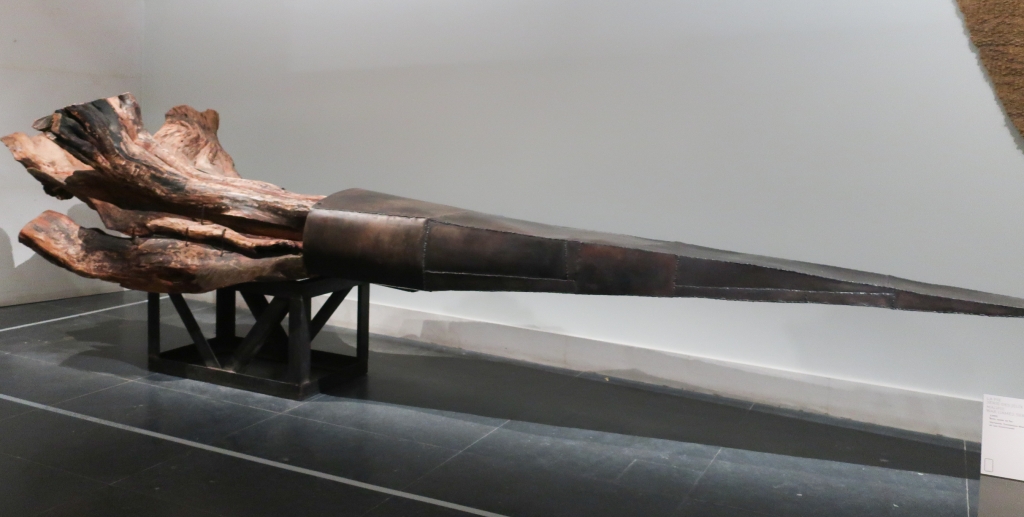 La monumentale sculpture appelée Pie (photo 9) composée de gros troncs d'arbre liés ente eux par un étui de tôle d'acier fait partie d'une série appelée Machine de guerre. Comme pour toutes les œuvres de Marina Abakanowicz elle ne dicte pas une lecture unique et on peut y voir aussi bien un oiseau aux ailes déployés avec un bec aérodynamique qu'un grand engin de guerre, le tranchant des armes étant évoqué par le manchon d'acier.