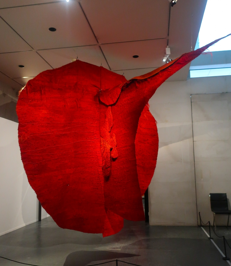 magnifique couleur mordorée. Elle fera aussi des pièces monumentales et totalement autonomes qu'elle appellera "Abakan". Abakan rouge (1969) (photo 2) pièce immense et spectaculaire en est un exemple emblématique qui ne laisse pas indifférent. Suspendue au plafond, elle offre au visiteur la possibilité de tourner autour et ainsi de la voir sous tous ses angles. Les fibres qui la composent sont rouge sang. Elle s'exhibe avec force et diffuse sa présence dans tout le lieu qu'elle occupe. Très provocante, à la fois érotique, viscérale, animale, végétale (gigantesque sexe féminin, crète de coq ou fleur vénéneuse...) elle pointe agressivement un très long dard particulièrement effilé vers le spectateur.
