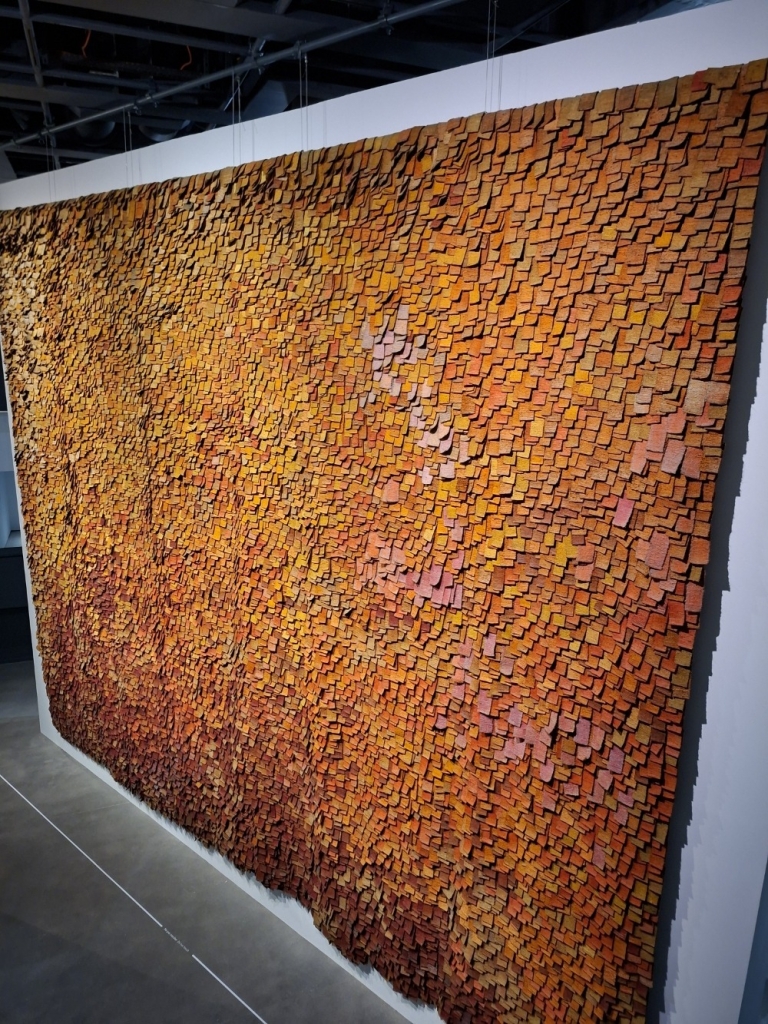 Olga de Amaral dont la Fondation nous avait régalés boulevard Raspail, mêle rigueur du Bauhaus et traditions artsanales pour un résultat éblouissant, un mur de bandelettes en laine et crin de cheval, aux couleurs des paysages locaux. (4)