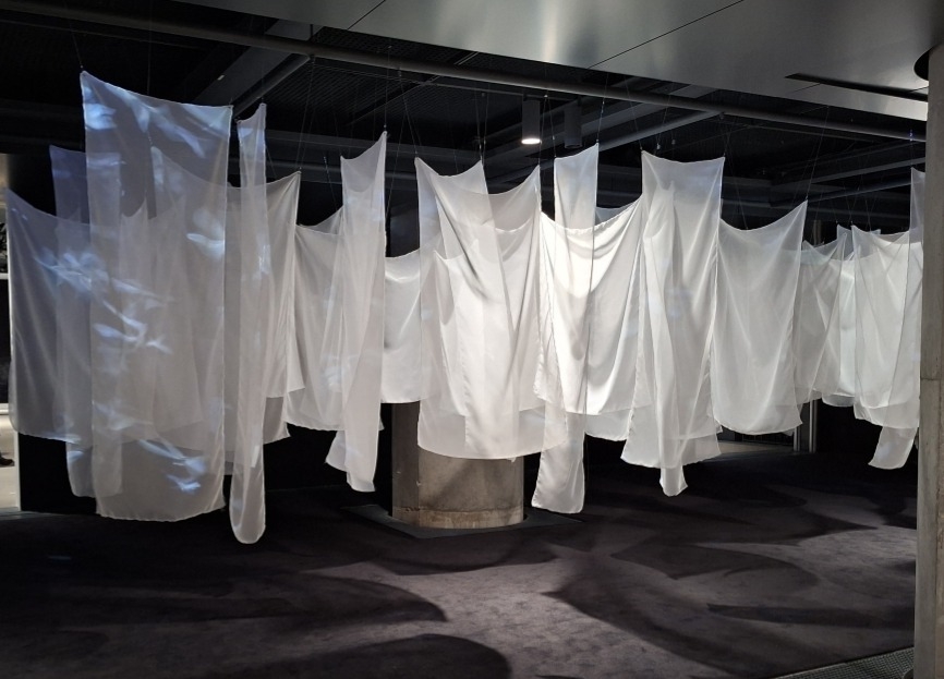 On ne fait que les deviner les Ephèmères, ces insectes volants et fugaces des marais qui font vibrer les voiles blancs de Christian Boltanski : dispositif tout aussi éphèmère qui évoque, comme toujours chez cet artiste, le transitoire de la communauté humaine, sa disparition inéluctable. (7)