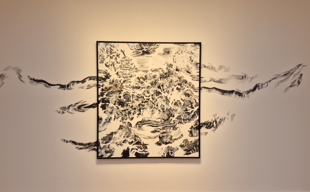 La fluidité de l'encre que l'artiste utilise pour ses dessins accentuent ce sentiment de transformation perpétuelle et d'instabilité des formes. En échappant au système binaire figuratif/abstrait, Abdelkader Benchamma nous fait entrevoir d'autres mondes, pénétrer dans des univers insaisissables, nous interroge sur l'infini et l'invisible. Il faut oeuvre métaphysique.