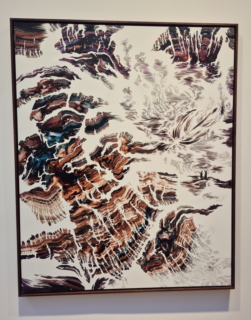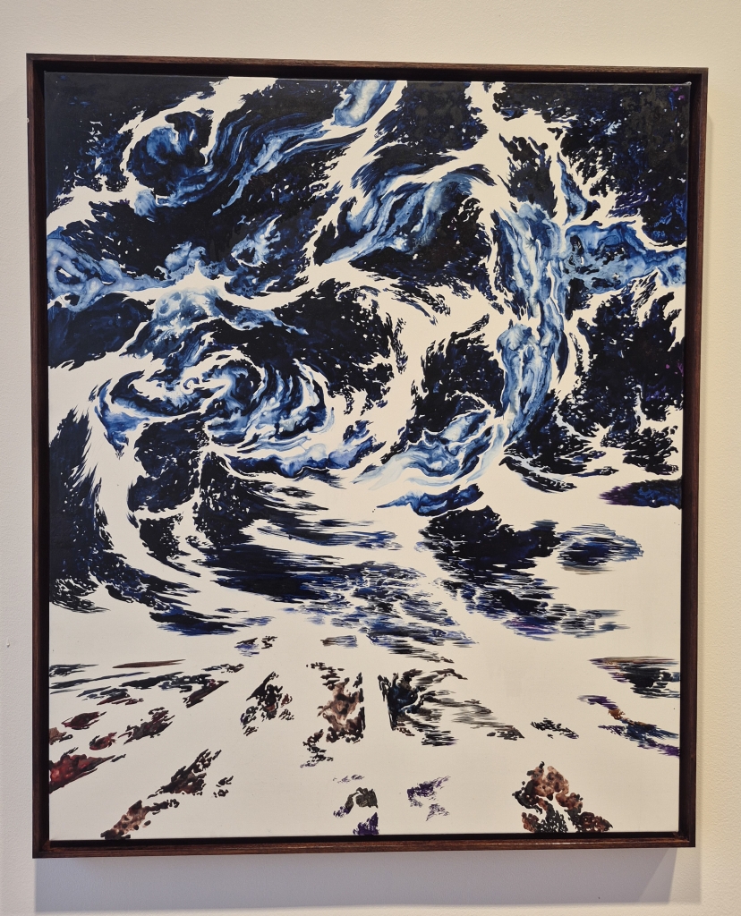 ; quelques détails, tels cet objet volant qui explose à droite ou ces tout petits personnates perdus dans l'immensité, semblent raconter une histoire. Il fait écho à une autre oeuvre (photo 2) où une tempête se déchaine mélant terre et ciel, le bleu et le noir, dans un mouvement dialectique entre l'air et la terre.